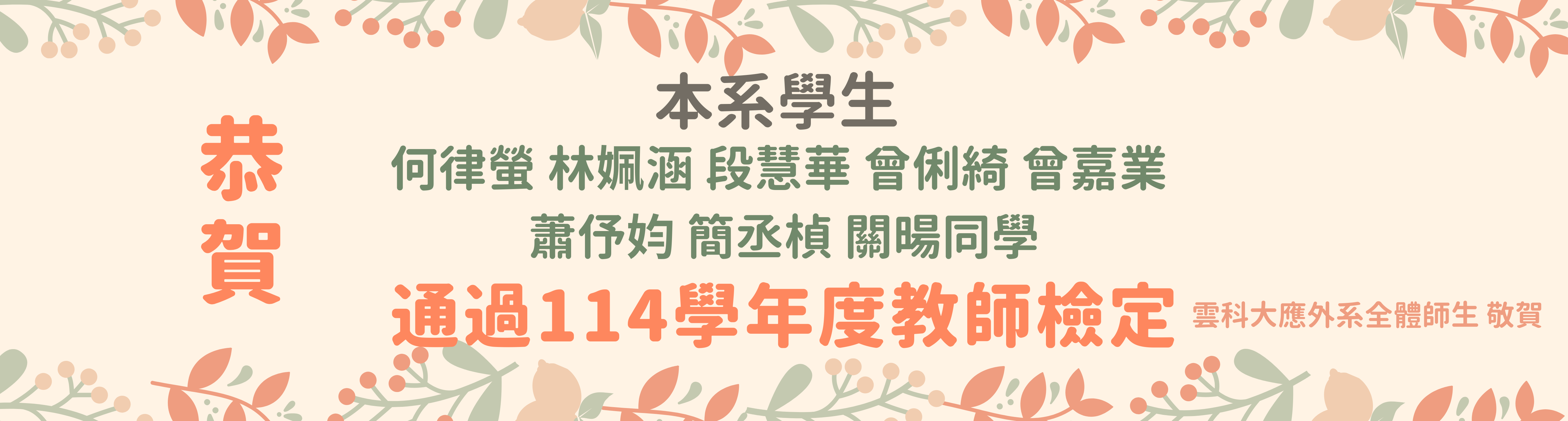 恭賀!本系學生何律螢、林姵涵、段慧華、曾俐綺、 曾嘉業、蕭伃㚬、簡丞楨、關暘 通過114學年度教師檢定