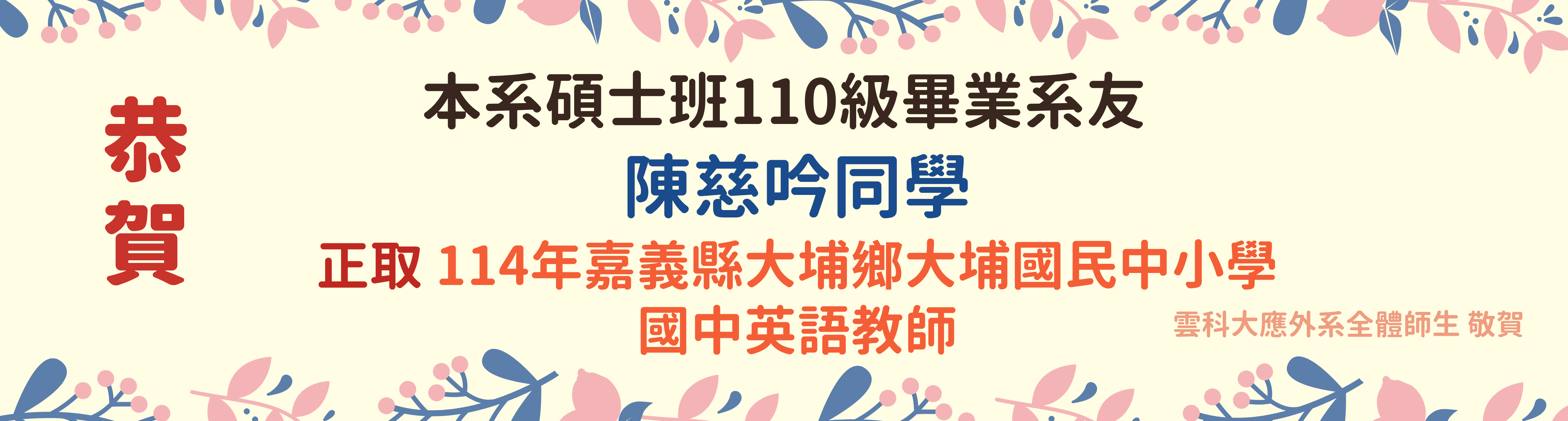 恭賀!本系碩士班110級畢業系友陳慈吟同學正取114年嘉義縣大埔鄉 大埔國民中小學國中英語教師