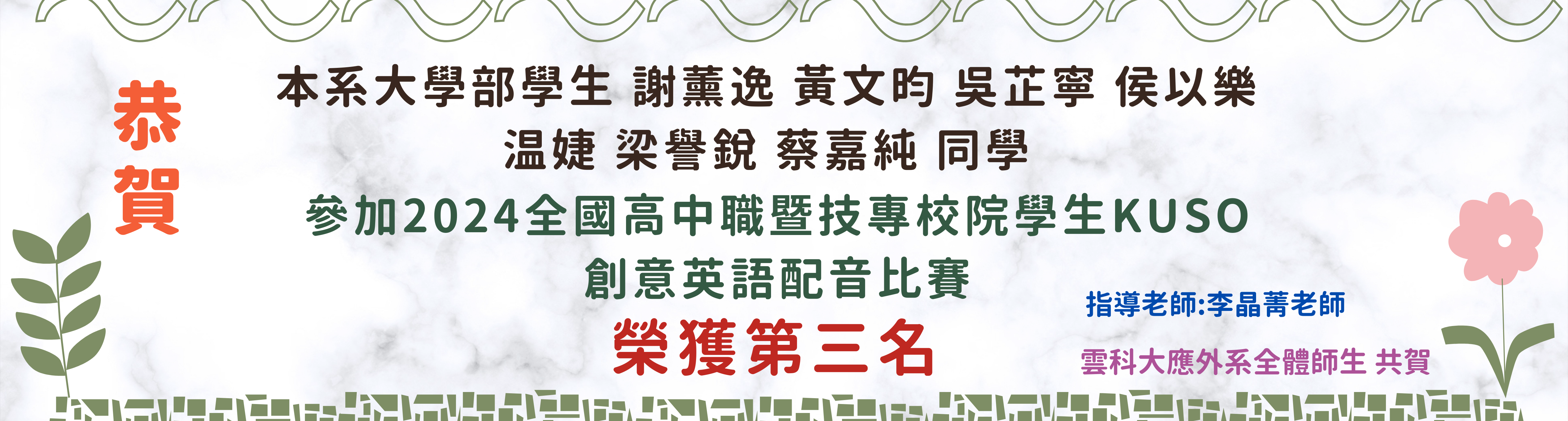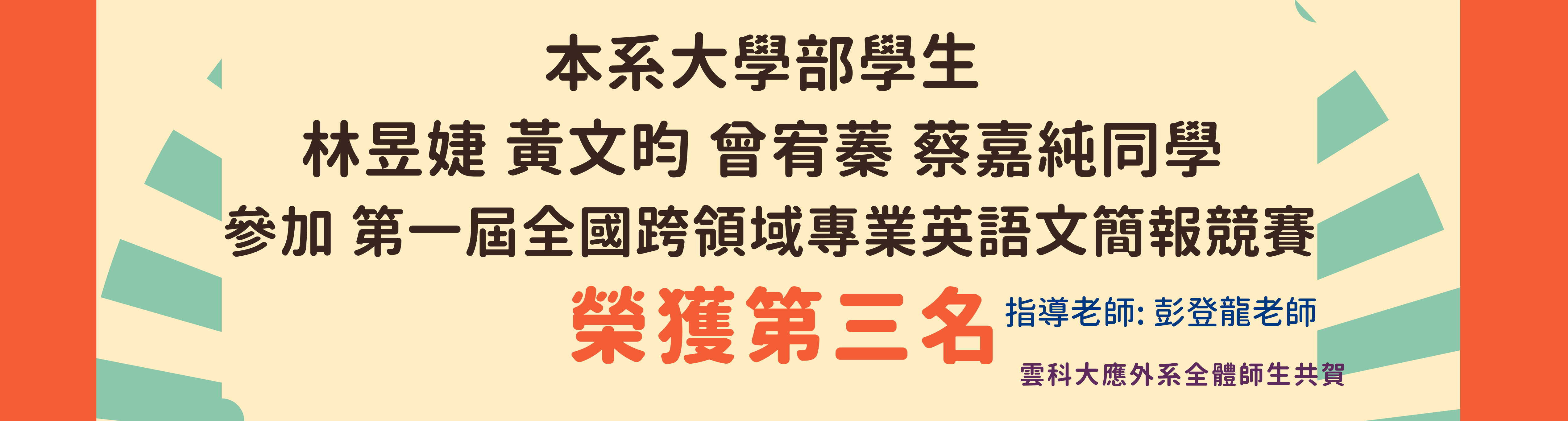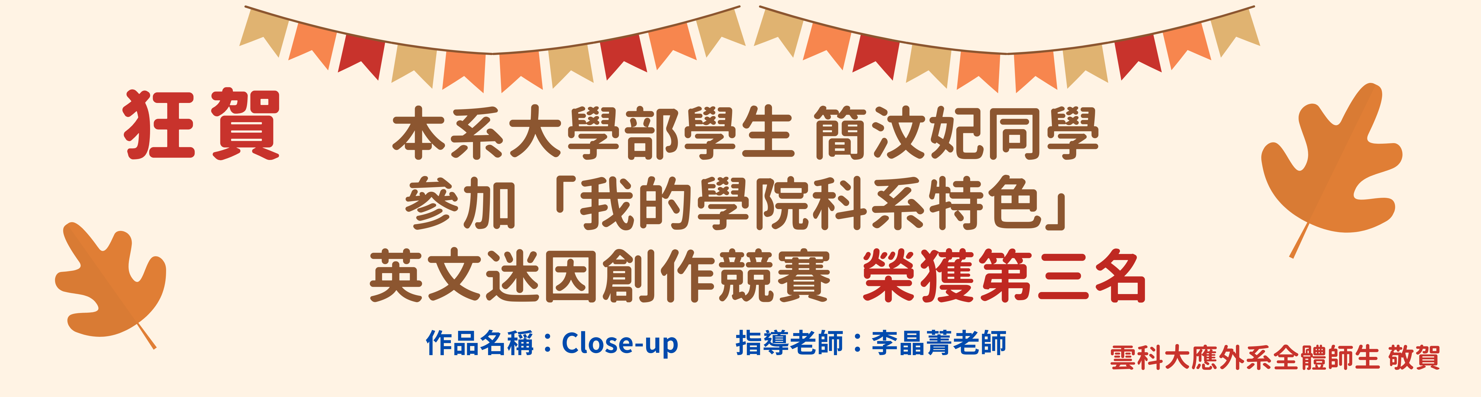 恭賀!本系大學部三年級 簡汶妃同學,參加「我的學院科系特色」英文迷因創作競賽 榮獲第三名