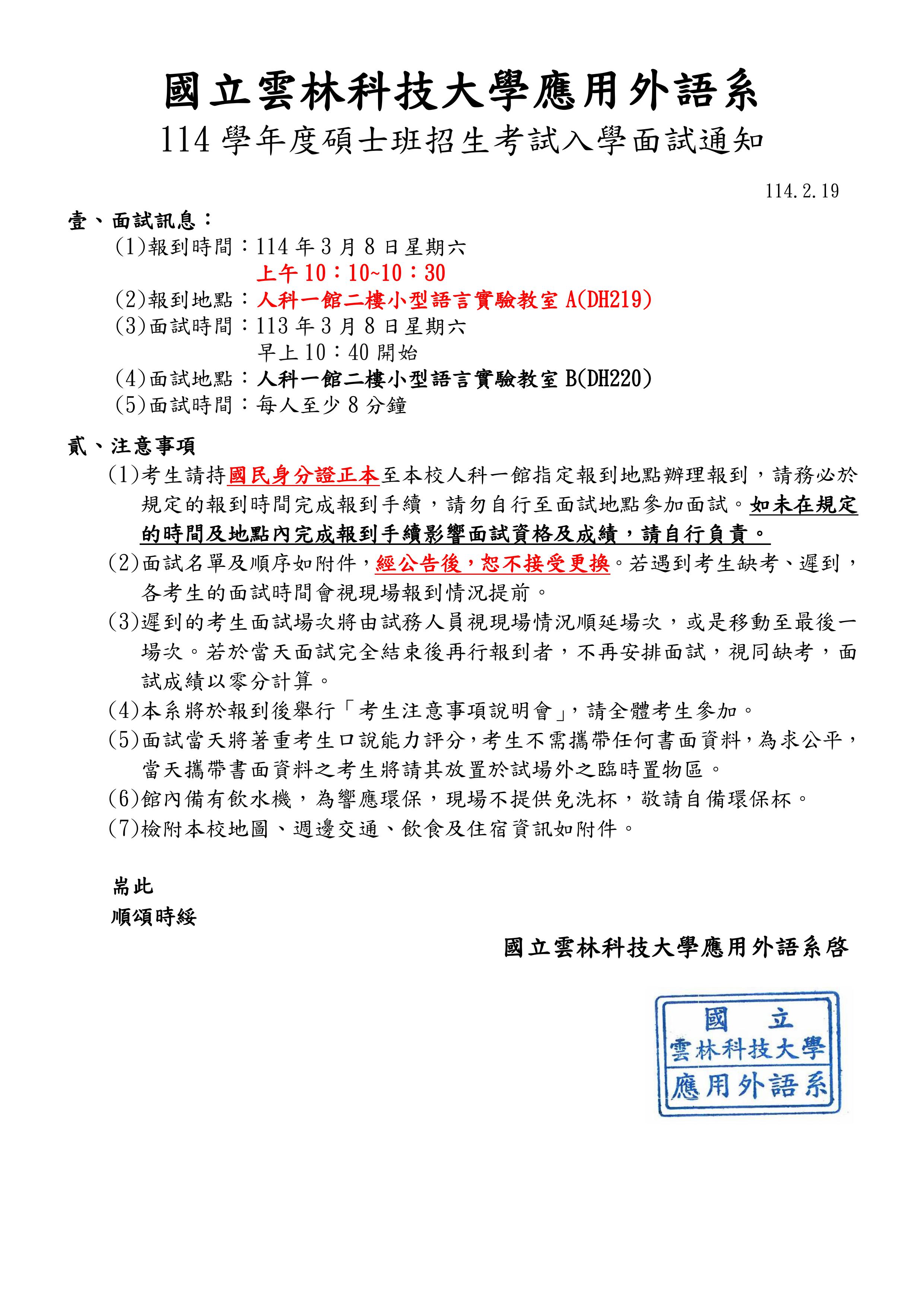 114學年度應用外語系碩士班面試通知