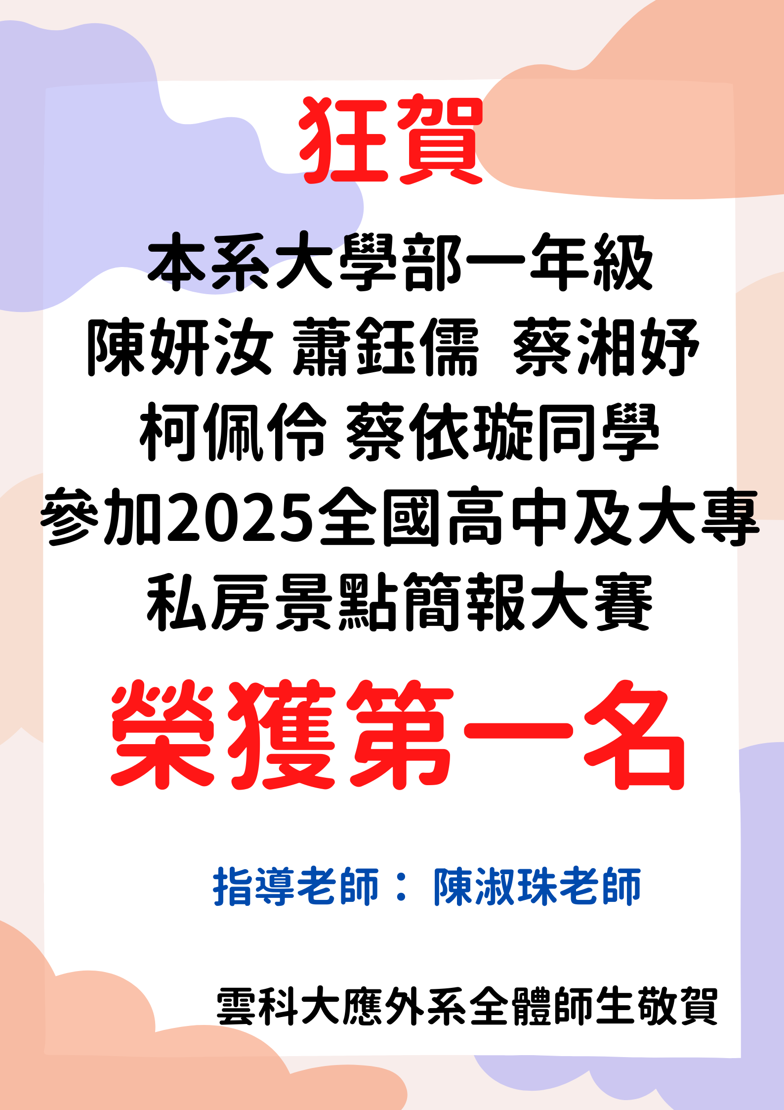 恭賀!本系大學部一年級陳妍汝、蕭鈺儒、蔡湘妤、柯佩伶、蔡依璇同學 參加2025全國高中及大專私房景點簡報大賽 榮獲第一名
