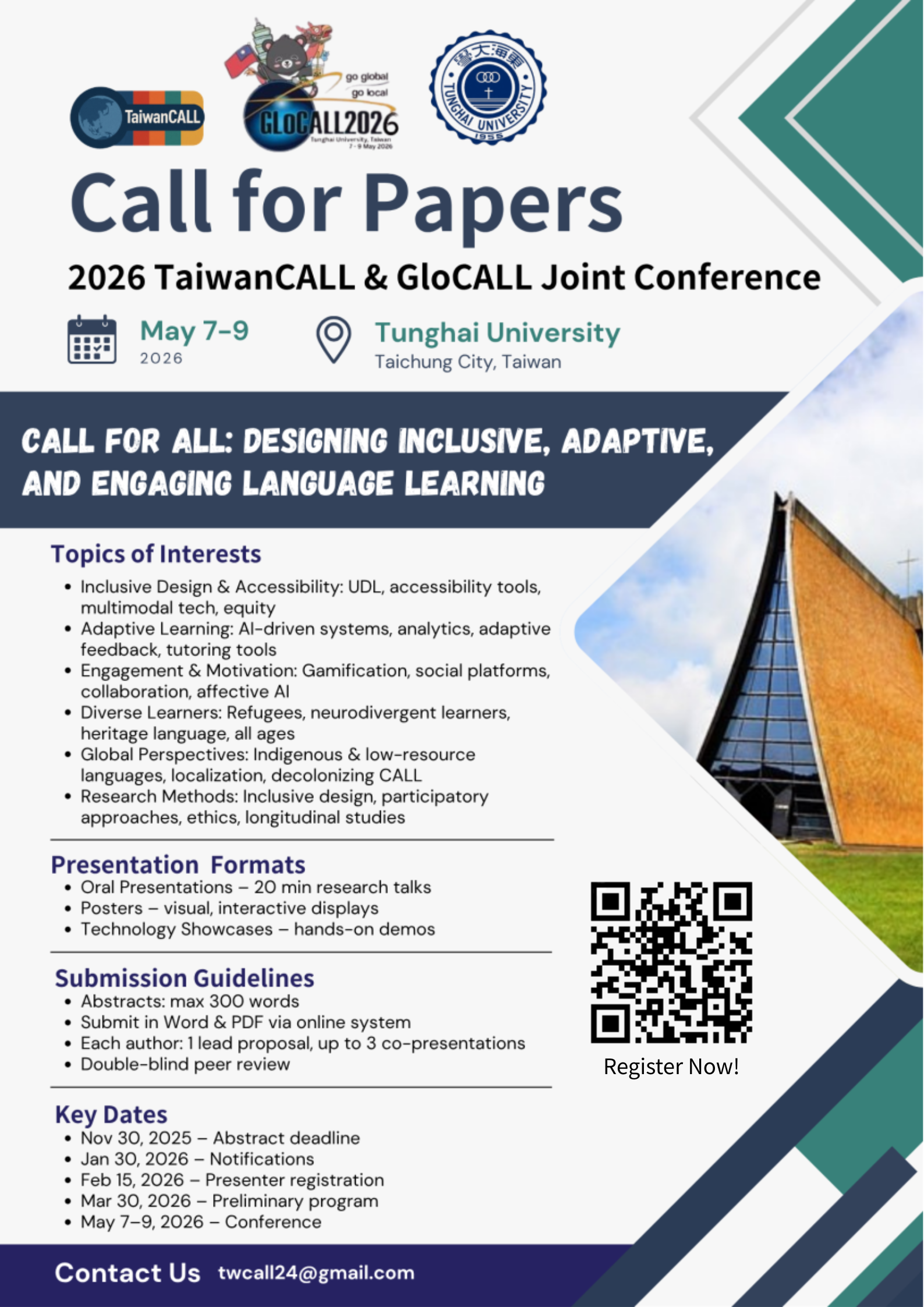 | 標題 | 東海大學外文系辦理「2026臺灣電腦輔助語言學習學會暨全球電腦輔助語言學習國際研討會」徵稿資訊 |