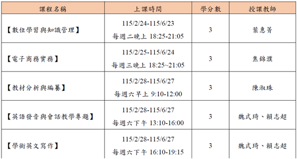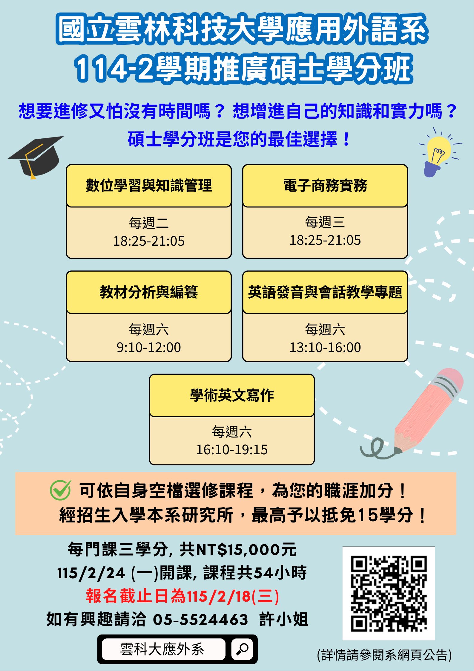 | 標題 | 114-2學期 推廣碩士學分班熱烈招生中~依自身空檔時間選修課程為您的職涯加分! |