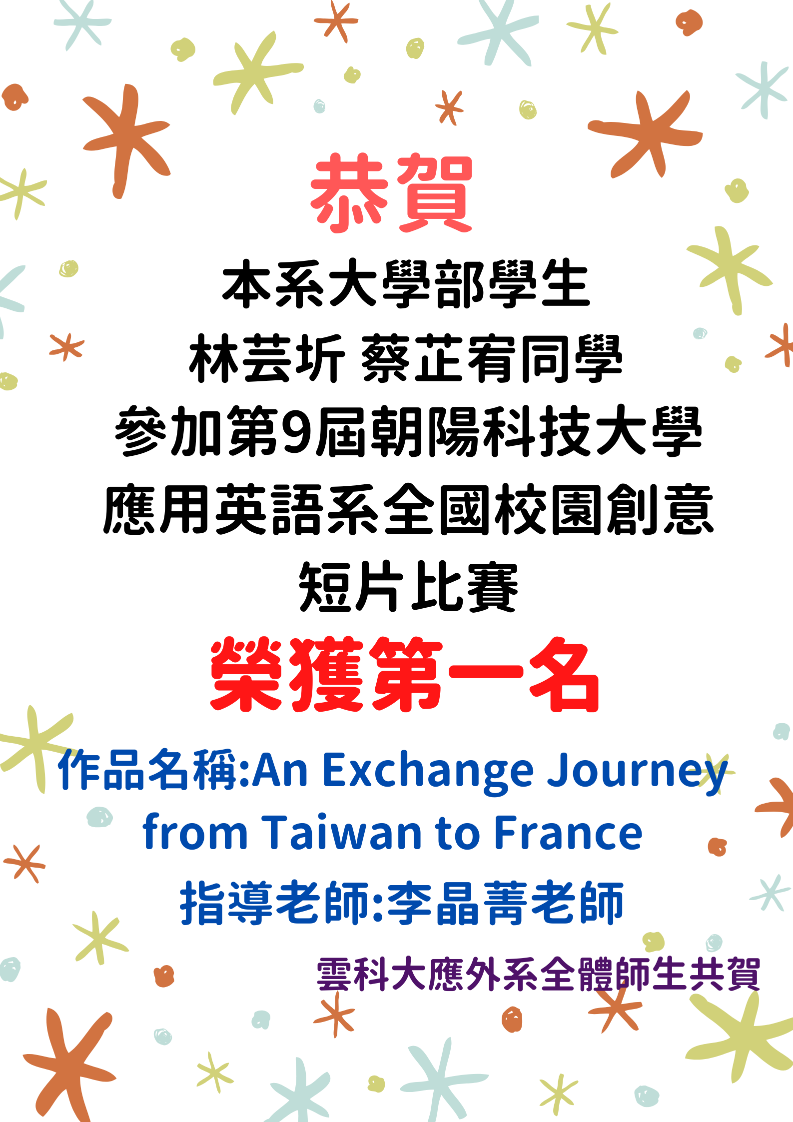 恭賀!本系大學部學生林芸圻、蔡芷宥同學 參加第9屆朝陽科技大學應用英語系全國校園創意短片比賽 榮獲第一名作品名稱:An Exchange Journey from Taiwan to France指導老師:李晶菁老師