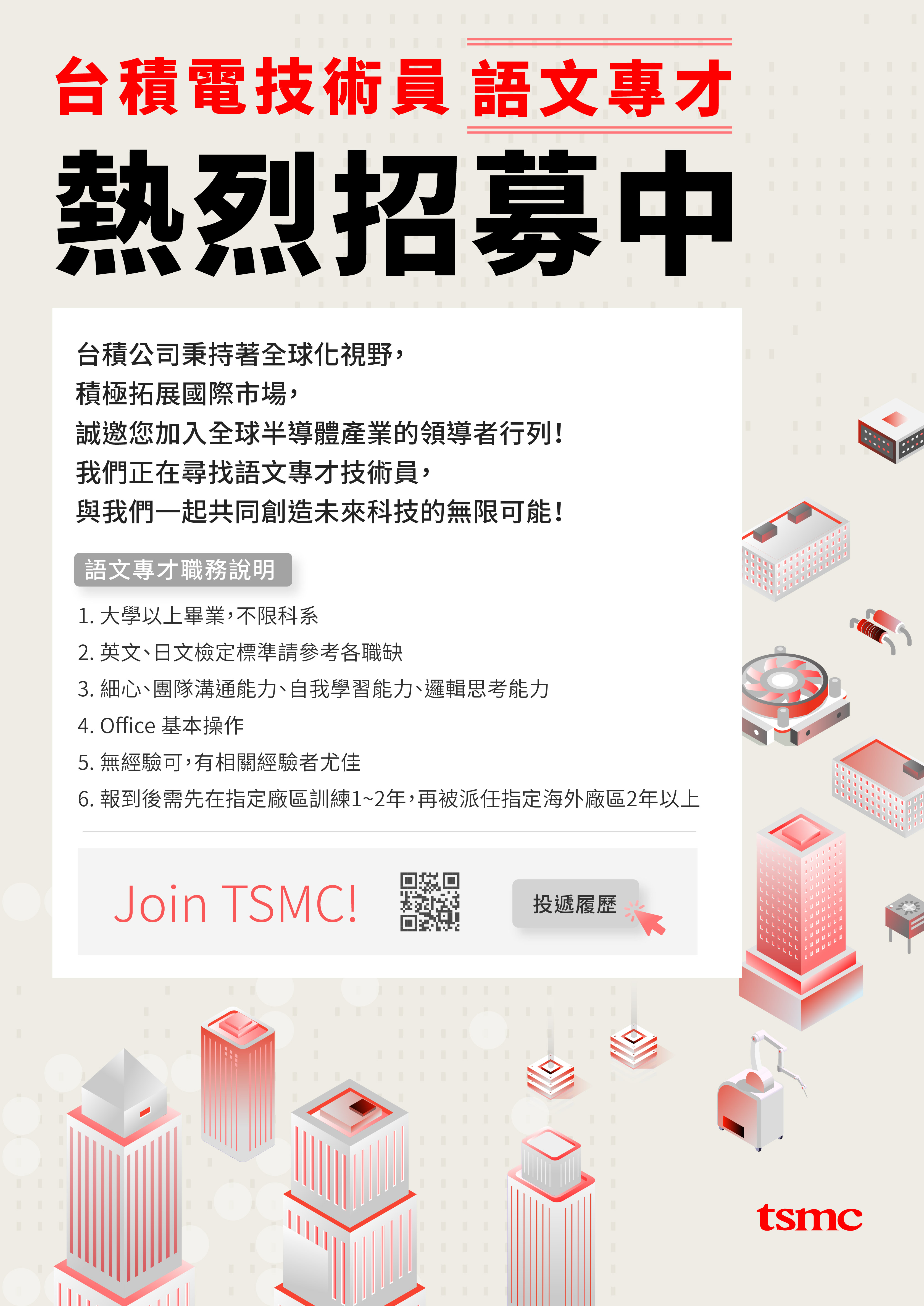 台積電正在尋找具備外語能力的技術員夥伴,公司提供卓越的職涯發展機會和具有競爭力的薪酬福利,除了月薪及年終獎金外,另享有員工分紅,誠摯邀請加入台積,與我們一起共創未來科技的無限可能!